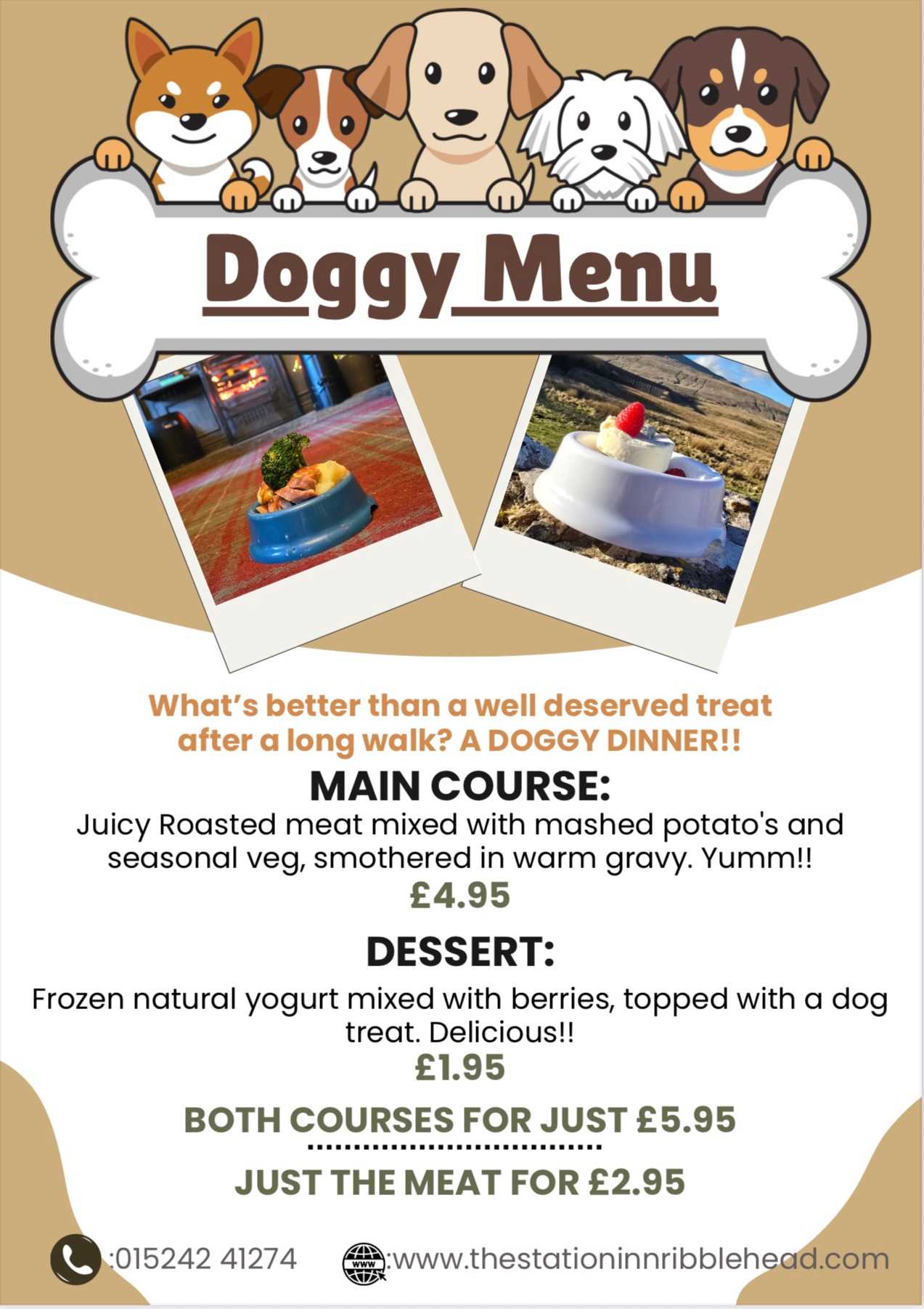 However our highlight is our lovingly prepared Doggy Dinner. Let them enjoy a main and a dessert whilst you enjoy the broader "Human" menu!